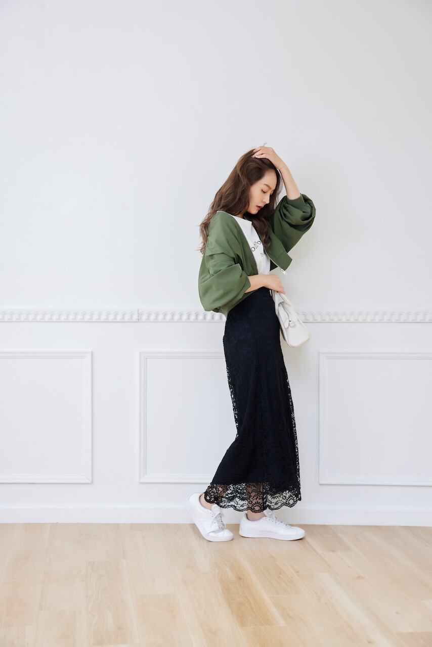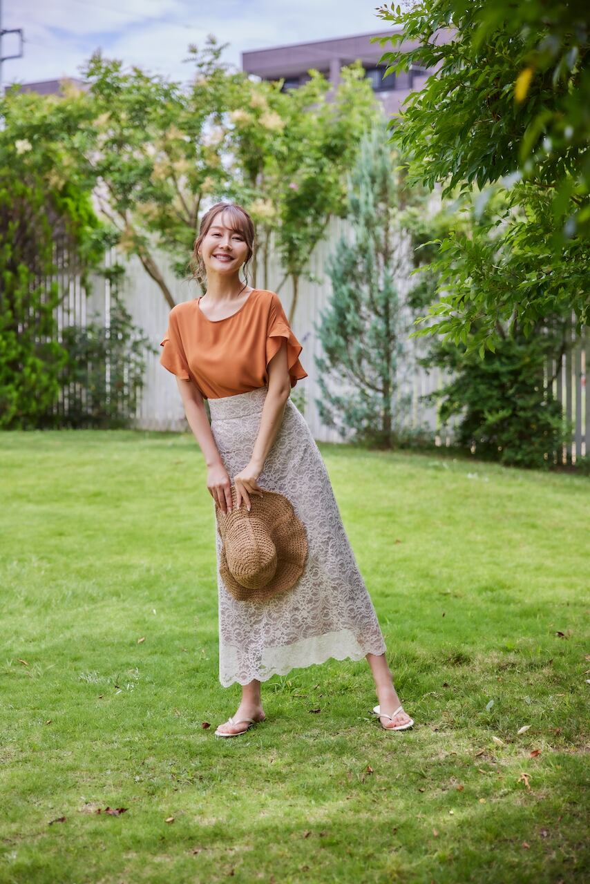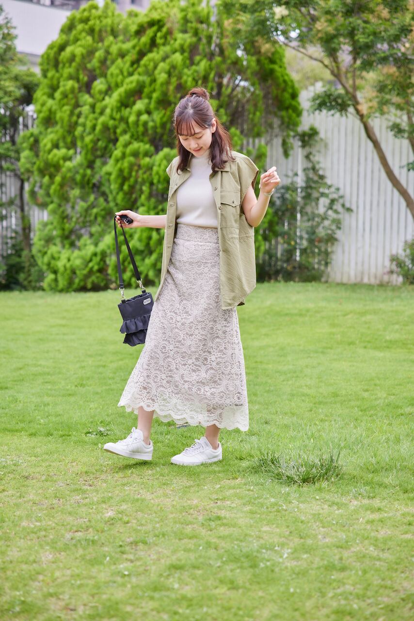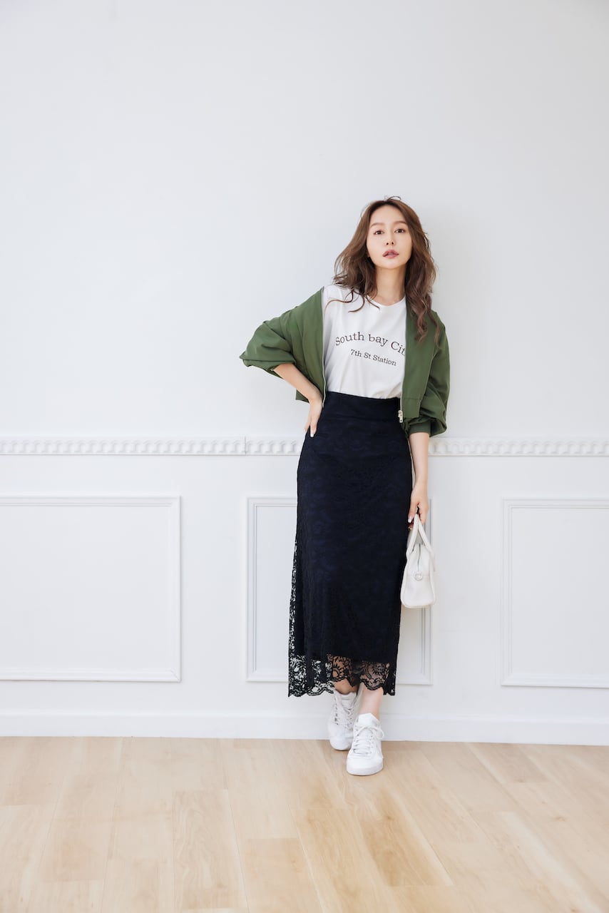 トップスをシンプルにして、スカートが主役になるコーディネートがオススメ。